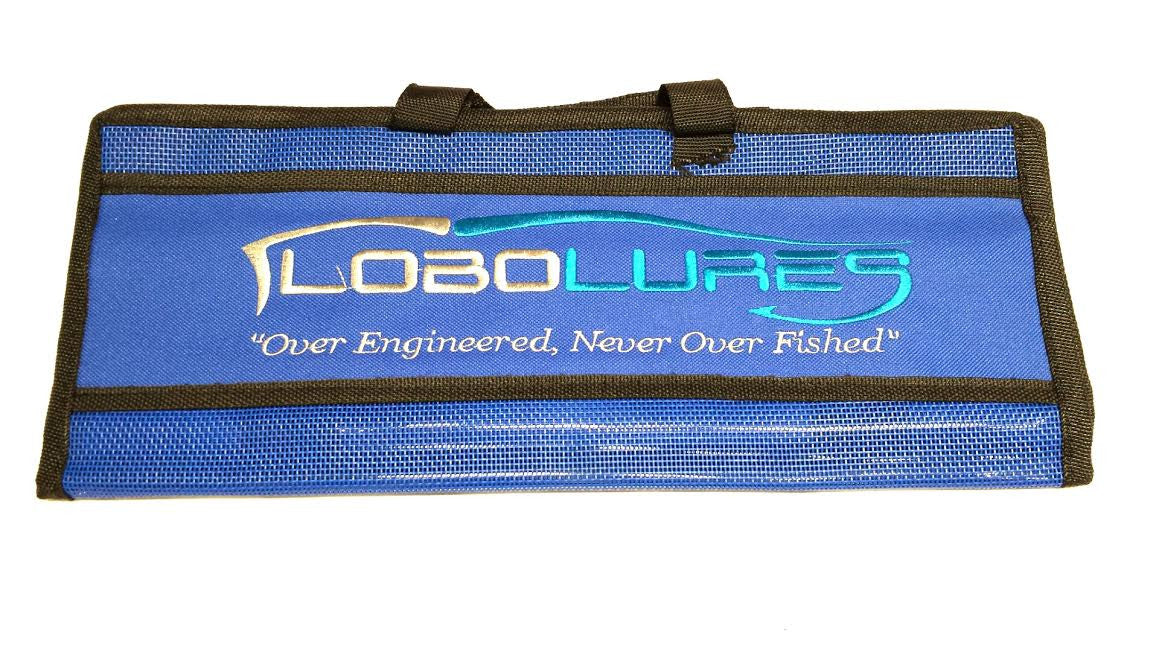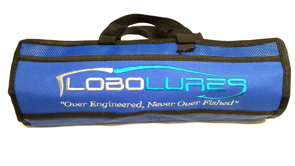 Lobo Lures Embroidered lure bags are manufactured from the best materials. This roll-up bag features six pockets that measure 9" wide by 3.75" deep, large enough to store your rigging and lures. With its clear view inside pockets and mesh backing it allows for quick selection and self draining/drying properties. The bag opens quickly and easily with a Velcro Closure.