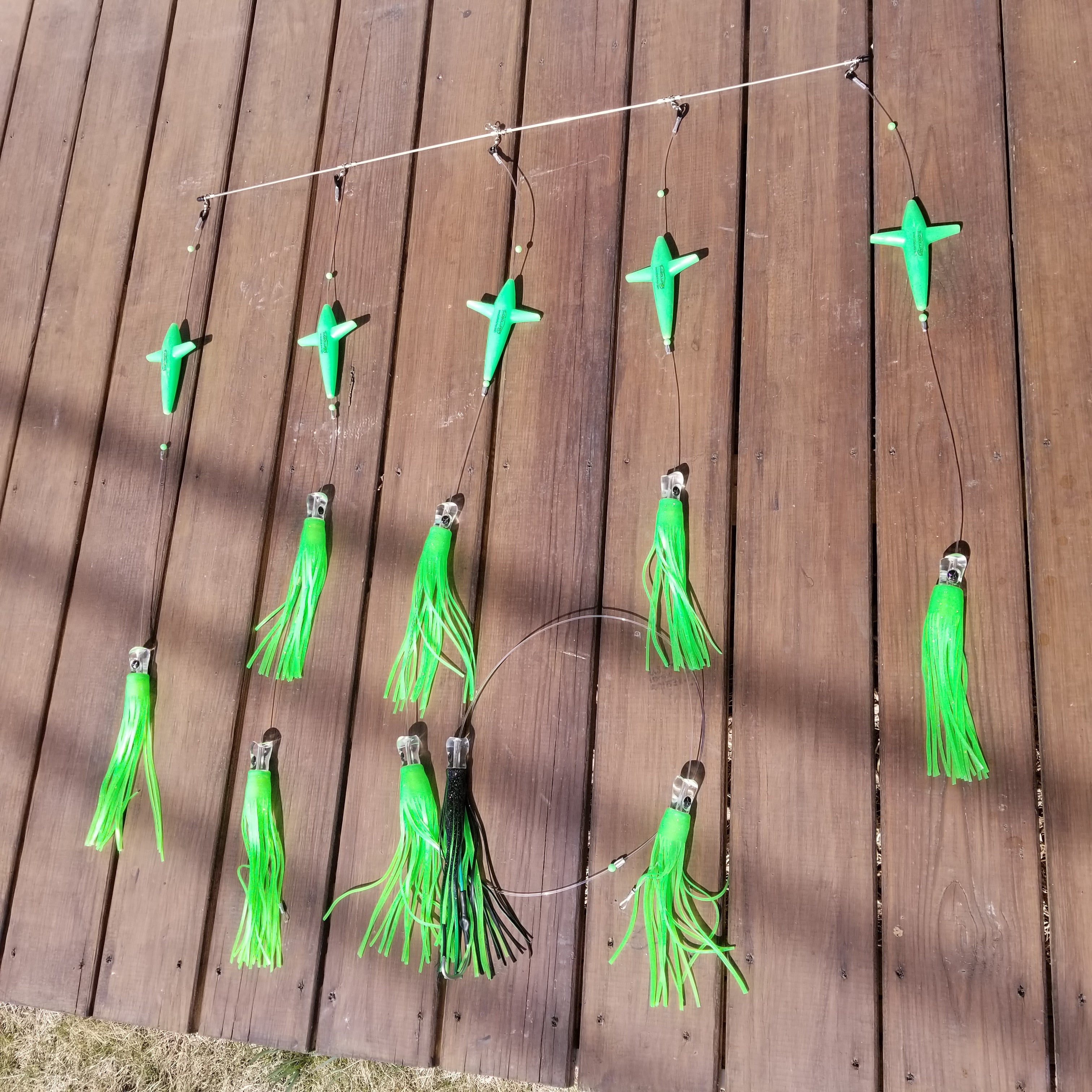 Spreader Bars were once the secret of the Northeast tuna fleets and has since become a sensation in the pursuit of big game fish. The spreader bar creates a unique situation in the water, by creating the illusion of schooling bait and the commotion of the Skipjacks in conjunction with the 5" Birds which peaks the curiosity of big game fish. The tailing squid is generally referred to as the stinger and it is the means of hooking up with a sturdy 12/0.