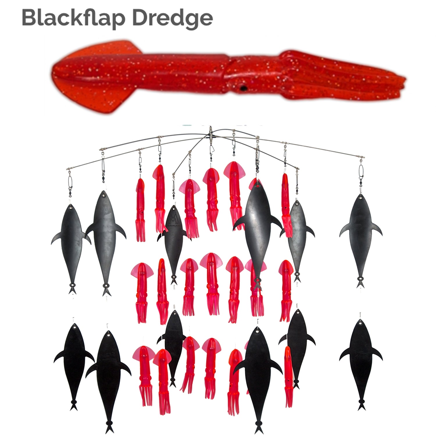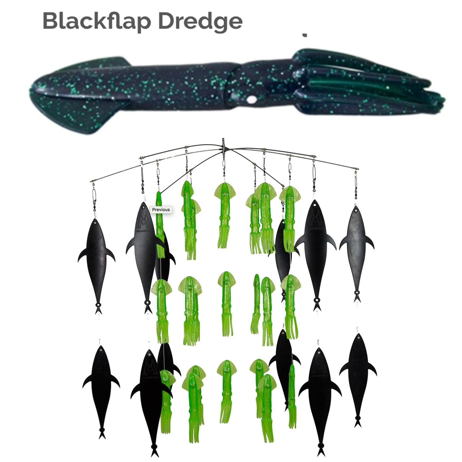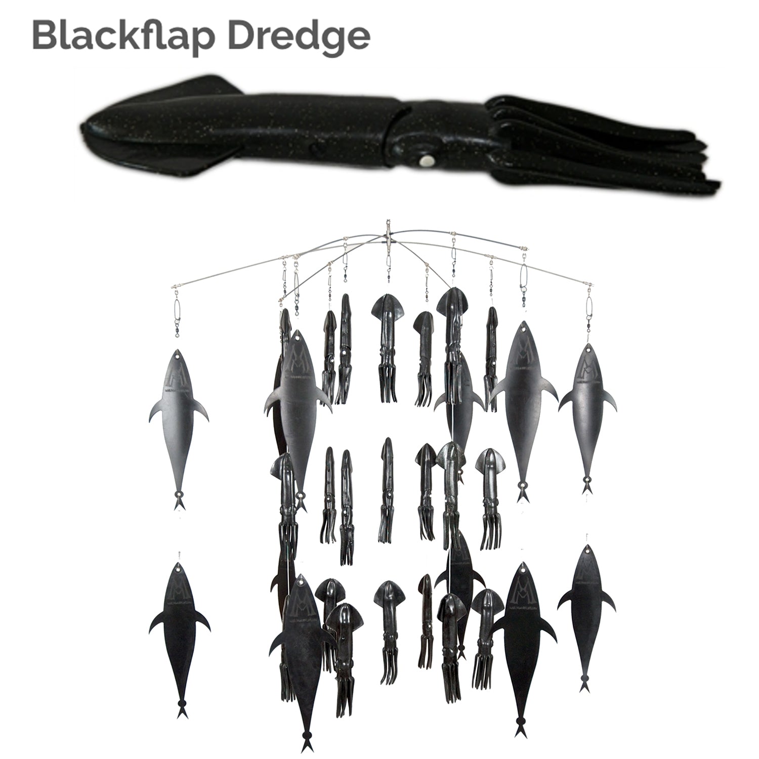 Squidnation has joined teams with Marlin Mudflaps to bring you the Blackflap Dredge. This dredge was inspired by the incredible success of both Squidnation Dredges and Marlin Mudflap Dredges in place like the Domican Republic, Costa Rica and the Bahamas. The action of the squids on the inside represent a ball of squids trying to defend themselves and the Mudflap tunas represent a pod of small tunas attacking the squid. This happens every single minute of every single day in our oceans. But now it can happen behind your boat. Nothing generates a strike from a top predator then smaller predators feeding. Create what works in nature and get more bites! Constructed of 7 chains of 9 inch Squidnation Squids and 6 13 inch Mudflap Marlin Tunas and a 36 inch stainless steel Strike Point Dredge Bar. Pick your favorite color squids and get ready for a strike!