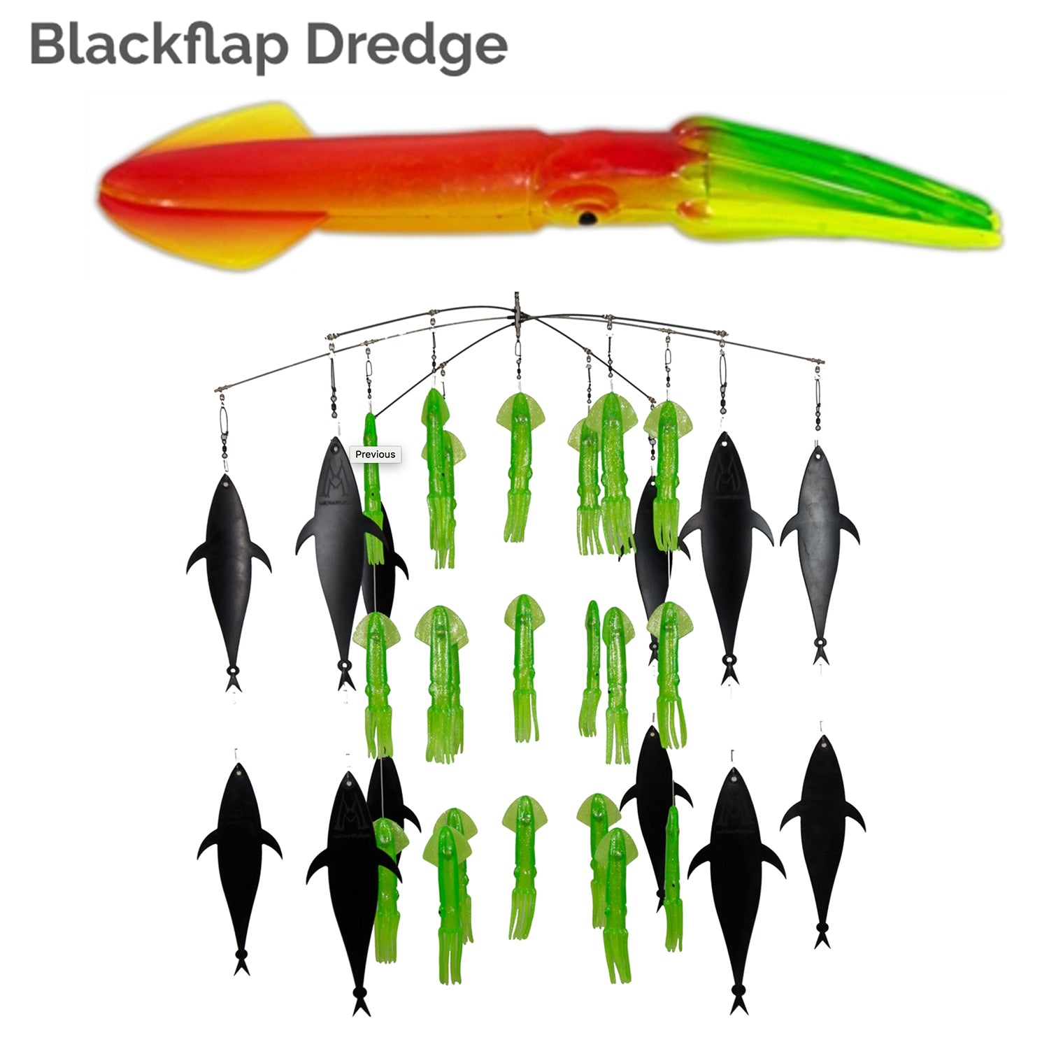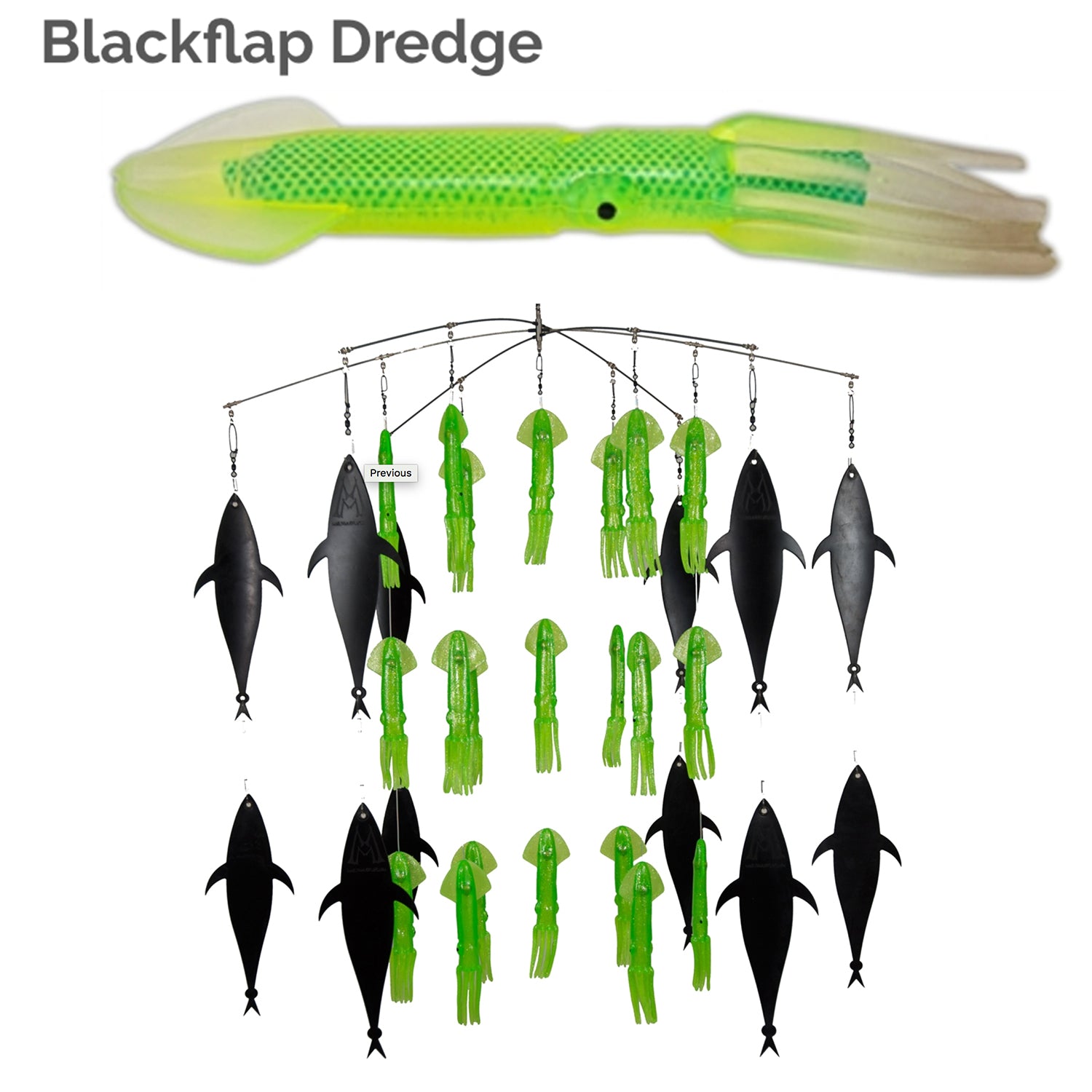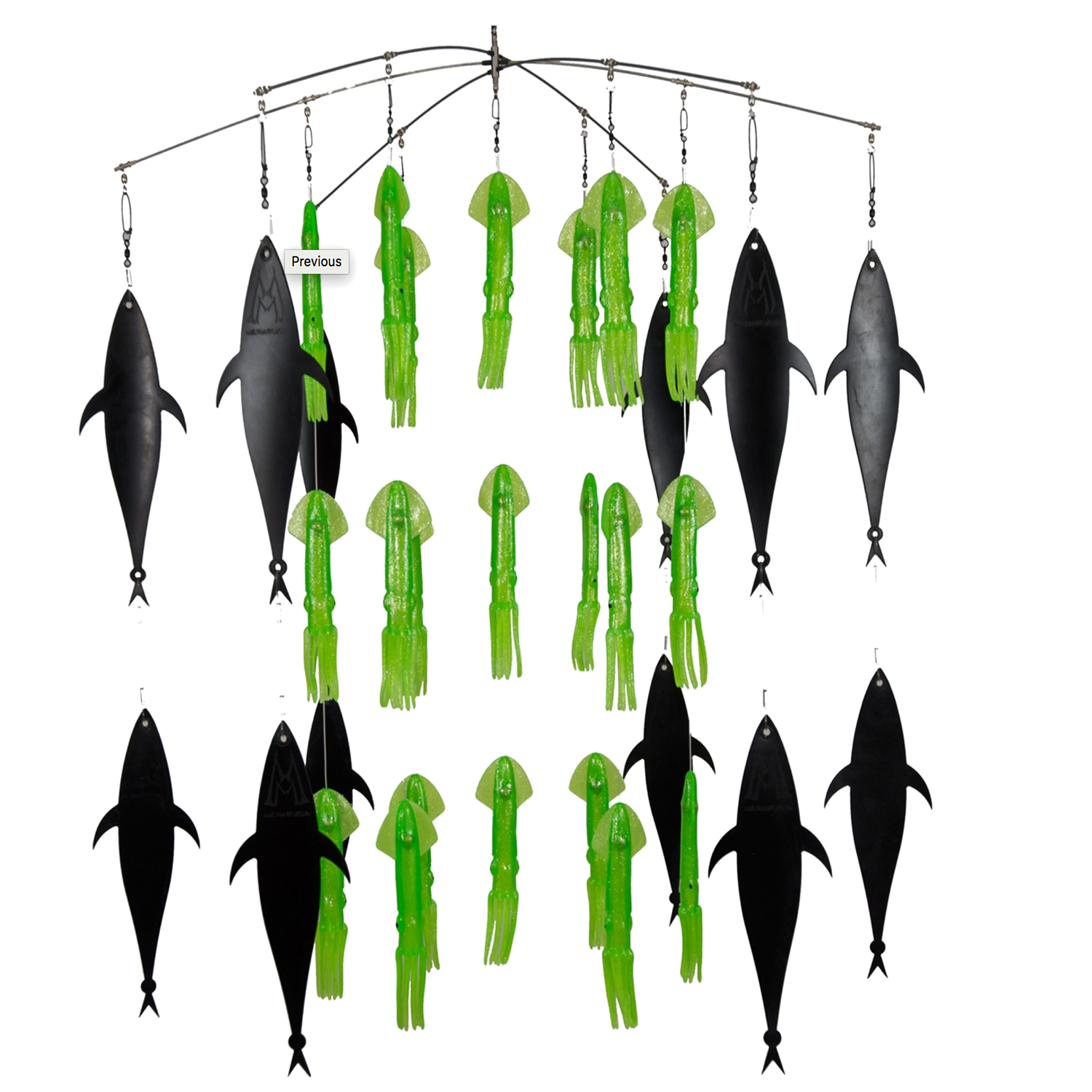 Squidnation has joined teams with Marlin Mudflaps to bring you the Blackflap Dredge. This dredge was inspired by the incredible success of both Squidnation Dredges and Marlin Mudflap Dredges in place like the Domican Republic, Costa Rica and the Bahamas. The action of the squids on the inside represent a ball of squids trying to defend themselves and the Mudflap tunas represent a pod of small tunas attacking the squid. This happens every single minute of every single day in our oceans. But now it can happen behind your boat. Nothing generates a strike from a top predator then smaller predators feeding. Create what works in nature and get more bites! Constructed of 7 chains of 9 inch Squidnation Squids and 6 13 inch Mudflap Marlin Tunas and a 36 inch stainless steel Strike Point Dredge Bar. Pick your favorite color squids and get ready for a strike!
